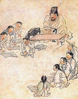 한 점의 풍속화가 사람들의 눈길을 끌고 있다. 이 작품은 요즘 급속도로 늘어나고 있는 서당을 묘사한 것이다. 다산 정약용의 말에 따르면 네댓 마을에 반드시 하나의 서당이 있을 정도라고 한다. 이제는 평범한 농민의 아들까지도 간단한 글자를 쓸 수 있게 되었다. |