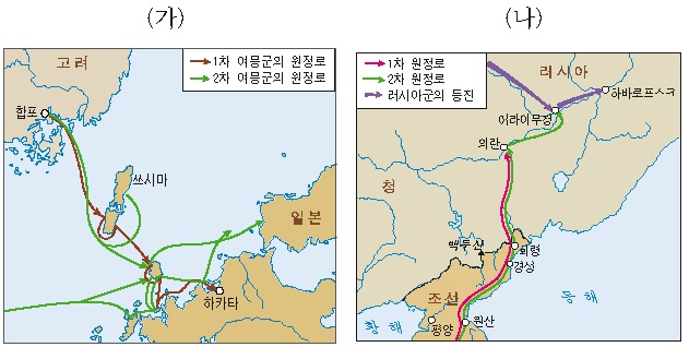 17. 지도의 (가), (나) 원정에 대한 설명으로 옳지 않은 것은? [3점]