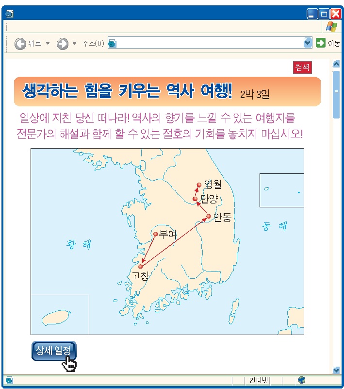 45. 어느 여행사 홈페이지에 실린 광고이다. ‘상세 일정’을 클릭했을 때에 나타날 수 있는 내용으로 옳지 않은 것은? [3점]
