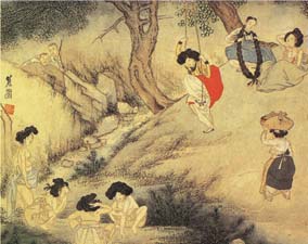 A: 이 그림은 신윤복이 이날의 세시풍속을 그린 거야. B: 이날은 쪽으로 만든 수리취떡도 먹어. |
