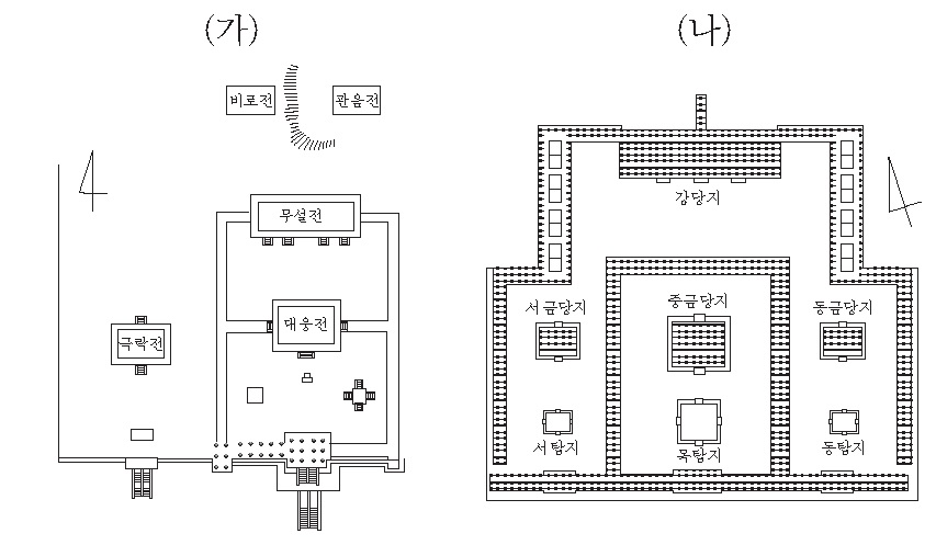 ㄴ. (김대성이) 현세의 부모를 위하여 OO사를 세우고, 전생의 부모를 위하여 석불사를 세워, 신림과 표훈 두 성사(聖師)를 청하여 각각 거처하게 하였다. ㄷ. 제24대 진흥왕 즉위 14년 계유 2월에 새로 대궐을 용궁남쪽에 지으려할 때에 거기에 황룡이 나타났으므로 이를 OO사로 고치고, 기축년에 담을 쌓아 17년 만에 완성하였다. ㄹ. 하루는 왕이 부인과 함께 사자사에 가다가 용화산 아래의 큰 못가에 이르렀을 때, 못 가운데서 미륵 삼존이 나타나므로 수레를 멈추고 공경의 예를 취하였다. 부인이왕에게 이르되, 나의 소원이니 이곳에 큰 절을 이룩하면 좋겠다고 하였다. |