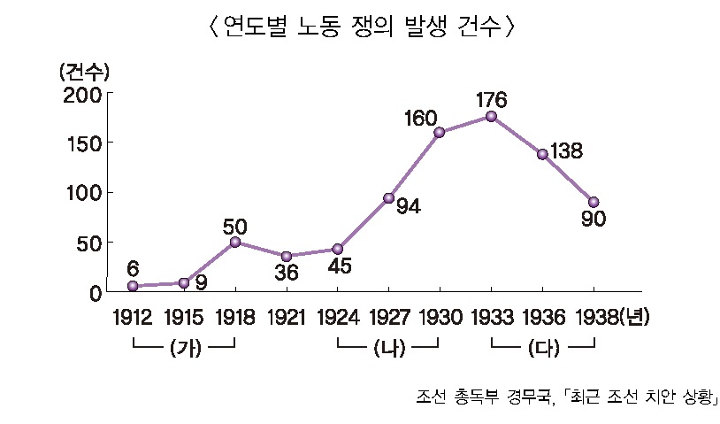 ㄴ. (나) – 전국적 규모의 노동 운동 단체가 결성되었다. ㄷ. (다) – 원산 노동자 총파업이 일어났다. ㄹ. (나), (다) – 사회주의 사상의 영향을 받았다. |
