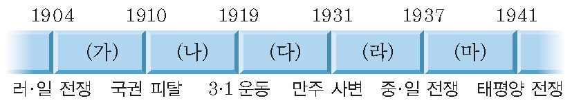 39. 다음 사건들이 일어난 시기를 연표에서 옳게 고른 것은? [1점]