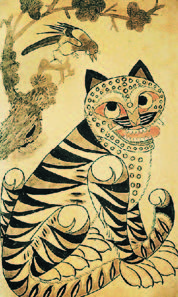 이것은 까치와 호랑이를 그린 것으로 서민들 사이에 널리 퍼진 그림 중 하나이다. 이러한 그림은 해, 달, 나무, 꽃, 동물 등을 소재로 하고있으며, 행복하게 살고 싶은 서민들의 소망을 담고 있다. |