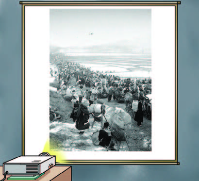 선생님: 1950년에 일어난 이 전쟁 당시 피란민의 모습입니다. |