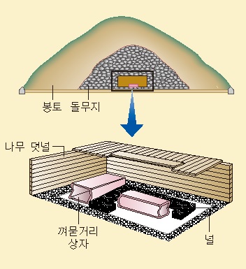 이 무덤은 지름 47m, 높이 12.7m이다. 평지 위에 나무 널과 껴묻거리 상자를 놓고, 그 바깥에 나무로 짠 덧널을 설치한 후, 냇돌을 쌓고 그 위를 흙으로 덮는 구조로 축조되었다. |