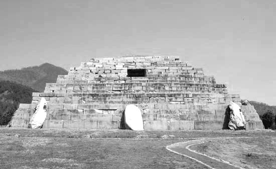 이 고분은 중국 지린성 지안에 있는 장군총이다. 잘 다듬은 큰 돌을 계단식으로 쌓아 올려 만든 돌무지무덤으로 둘레에는 커다란 자연석을 기대어 놓았다. |