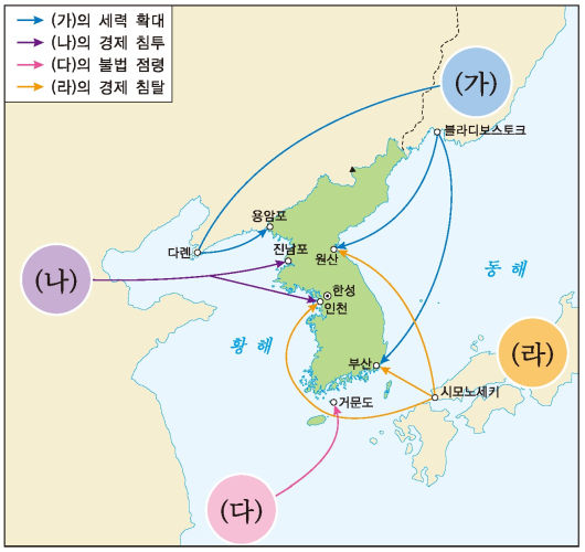 ㄴ. (나) – 톈진 조약의 체결로 인해 조선에서 군대를 철수하였다. ㄷ. (다) – 천주교 선교 문제로 인해 조선과의 조약 체결이 지연되었다. ㄹ. (라) – 조선과 방곡령 관련 조항이 포함된 통상 장정을 체결하였다. |
