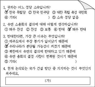 4. 다음 가상 설문지의 (가)에 들어갈 내용으로 가장 적절한 것은? [3점]