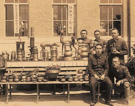이 사진은 금속류 회수령에 따른 공출을 기념하기 위해 찍은 것이다. ‘구리나 철을 남기는 것은 부끄러움을 남긴다.’, ‘결전 아래 금속류 공출을 앞장서서 실행하자.’ 라는 표어가 걸려 있다. |