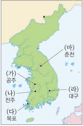 8. 다음 답사 지역을 지도에서 옳게 찾은 것은? [2점]