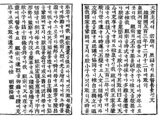 선생님: 이것은 고종이 종묘에 바친 독립서고문으로 홍범 14조가 포함되어 있습니다. 홍범 14조는 김홍집과 박영효의 연립 내각이 주도한 이 개혁의 기본 방향이 되었습니다. |