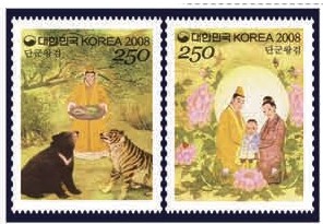 선생님: 이 우표에는 곰에서 인간이 된 웅녀가 환웅과 결혼하여 단군왕검을 낳은 이야기가 그려져 있습니다. 이 단군왕검이 세웠다고 전해지는 나라에 대해 말해 볼까요? |