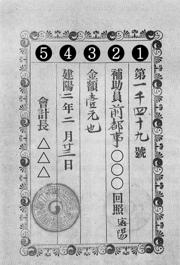 ❷ 독립문 건립에 보조금을 납부한 인물의 이름 : ○○○ ❸ 보조금 납부 액수 : 1원 ❹ 영수증 발행 날짜 : 건양 2년(1897년) 2월 23일 ❺ 영수증을 발행한 회계장의 이름: △△△ |