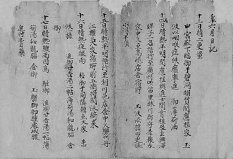 자료는 명성 황후의 피난 과정이 적혀 있는 일기이다. 구식 군인들이 별기군과의 차별 대우에 반발하여 일으킨 이 사건으로 명성황후는 피난을 가야 했다. 일기에는 명성 황후가 궁궐로 돌아오기까지의 이동 경로 등이 기록되어 있다. |