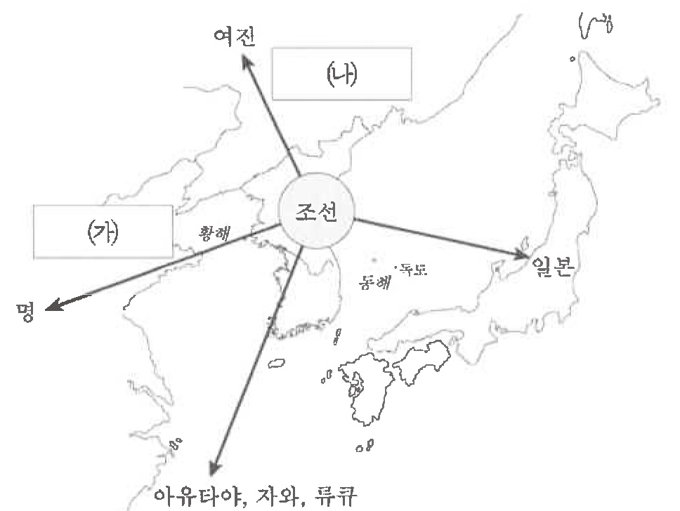 6. <보기>는 조선 전기의 대외 관계를 나타낸 지도이다. (가), (나)에 들어갈 내용으로 가장 옳은 것은?