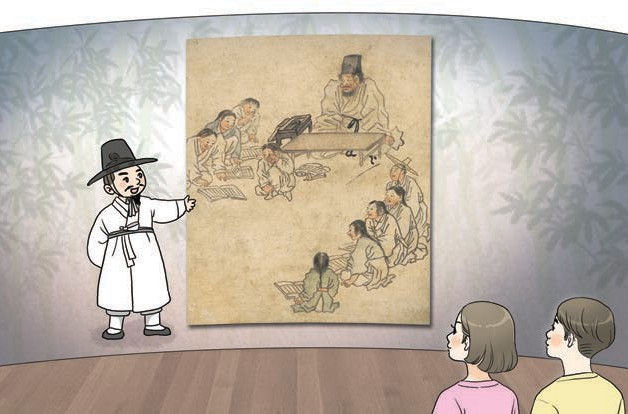 이 그림은 서당의 모습을 그린 김홍도의 풍속화입니다. 훈장 앞에서 훌쩍이는 학생과 이를 바라보는 다른 학생들의 모습이 생생하게 표현되어 있습니다. |