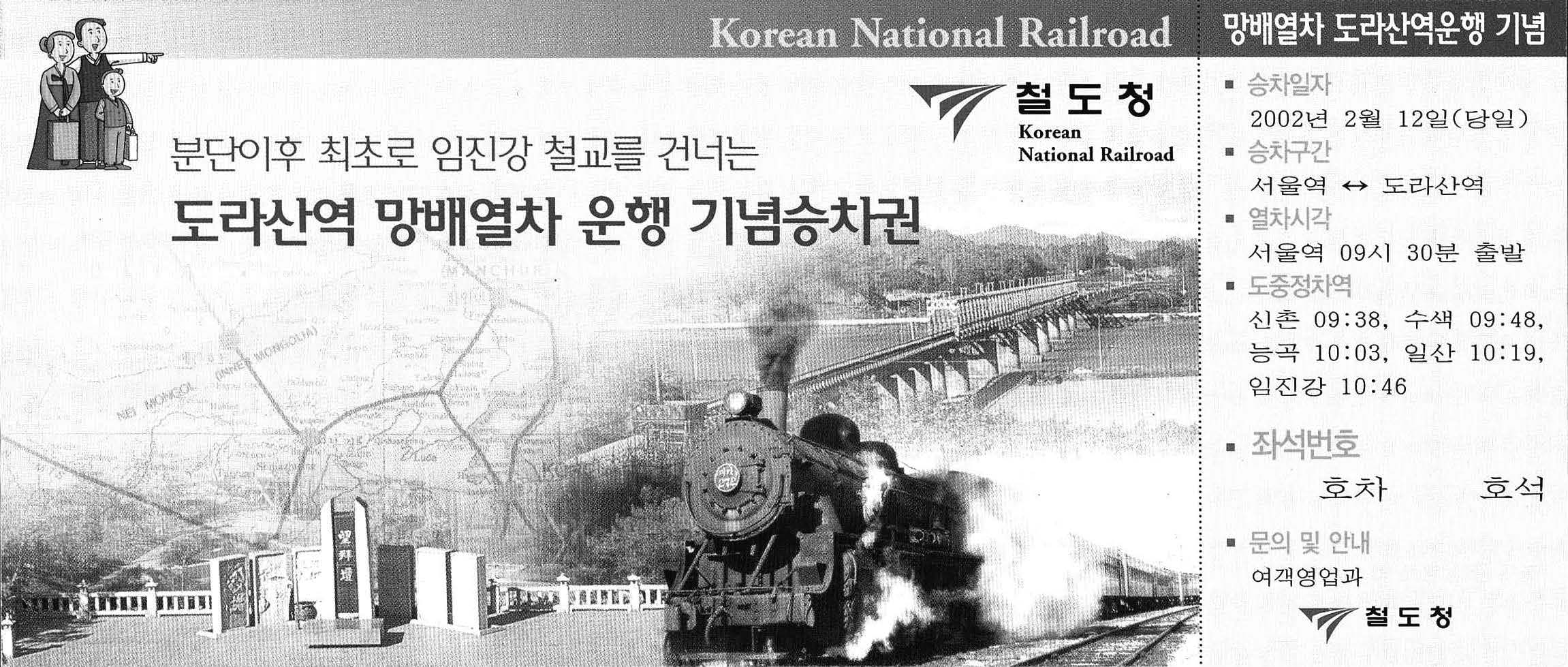 사진은 2002년에 발행된 ‘도라산역 망배*열차 운행 기념승차권’이다. 실향민들이 탑승한 이 열차는 설날에 서울역을 출발하여 임진강 철교를 건너 도라산역에 도착하였다. 국내 철도역 중 북한과 가장 가까운 도라산역은 남북 정상 회담 이후 추진된 경의선 철도 복구 사업의 일환으로 건설되었다.