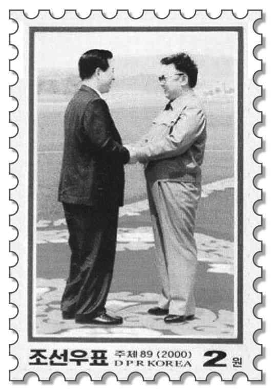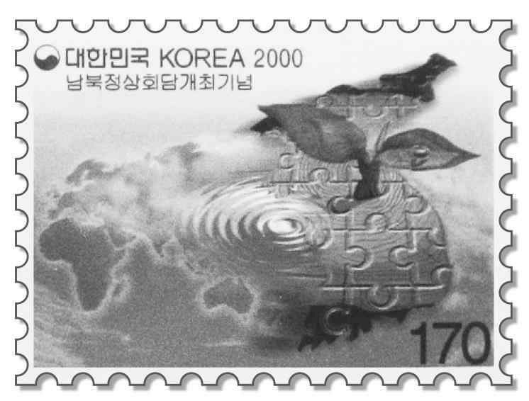 | 분단 이후 최초로 개최된 남북 정상 회담을 기념하여 제작된 우표이다. 대한민국 우표는 한반도에서 싹트는 희망의 새싹을 표현하였고, 북한 우표는 남북 정상이 만나는 장면을 담고 있다. 두 정상은 이산가족 상봉과 경제 협력 등의 내용을 담은 6ㆍ15 남북 공동 선언을 발표하였다. | |