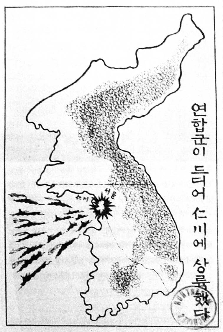 자료는 (가)에서 국군과 유엔군의 인천 상륙 작전이 성공했음을 알리고 인민군에게 투항을 권유하는 전단이다. 전단의 뒷면에는 인민군의 보급선이 단절되었고 후퇴할 길도 막혔으니 죽음과 항복 가운데 하나를 선택하라는 내용이 담겨 있다.