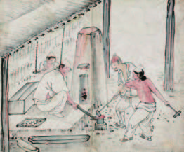 이 그림은 김득신이 대장간의 모습을 묘사한 풍속화이다. 한 명이 화덕에서 달궈진 쇳덩어리를 방울집게로 집어 모루 위에 올려놓자 두 명이 쇠망치로 두드리는 모습, 도리에 매어 놓은 그네에 상체를 기대고 어깨너머로 구경하는 아이의 모습 등이 생동감 있게 표현되어 있다. |