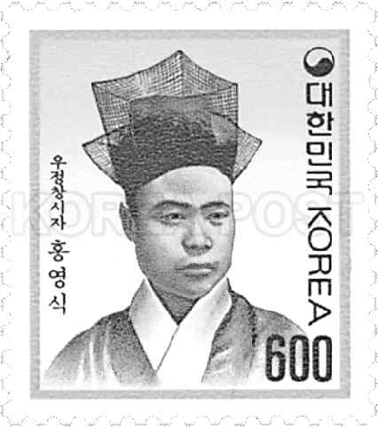 이 우표의 인물은 우편 업무를 담당한 우정총국의 총판이었던 홍영식이다. 그는 1884년 우정총국 개국 축하연에서 김옥균 등과 함께 정변을 일으켰다. |
