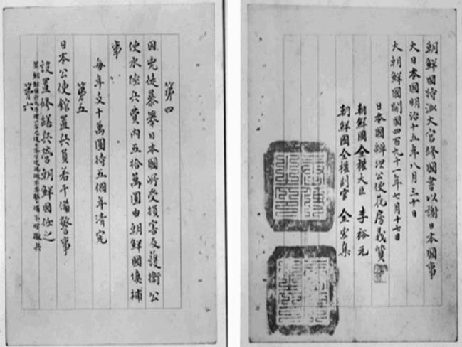 자료는 제물포 조약문의 일부이다. 일본은 이 사건 당시 자국 공사관이 습격받은 일을 구실로 제물포 조약 체결을 강요하였다. 조약의 제4조는 손해 배상 및 군비를 일본에 지불할 것, 제5조는 일본 공사관에 군인을 두어 경비한다는 것을 규정하고 있다.