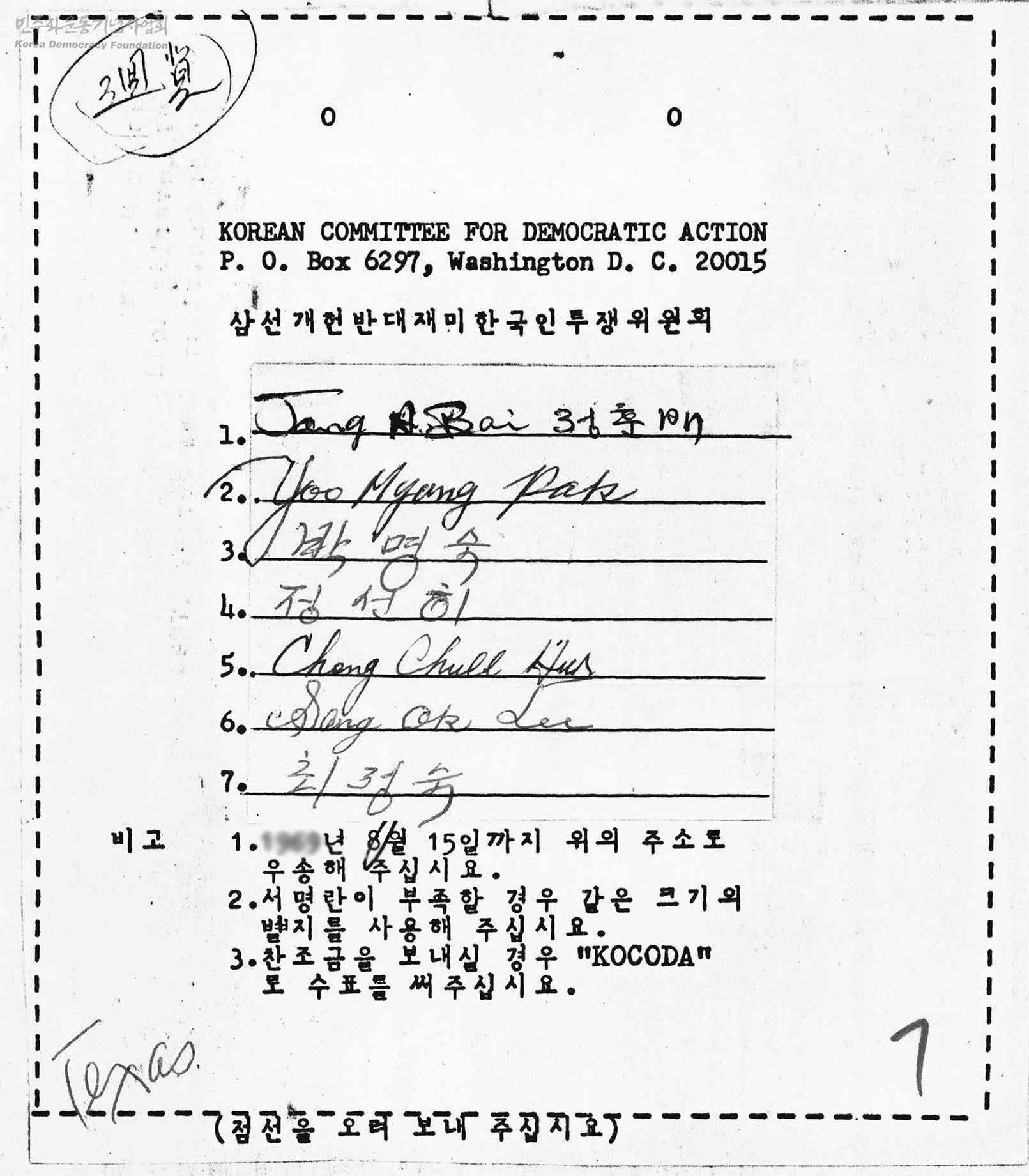 자료는 미국에 거주하는 한인들이 추진한 개헌 반대 운동의 서명부로, 이 정부에서 국가 안보 강화와 지속적인 경제 개발을 내세우며 대통령의 3선을 허용하는 개헌을 추진하자 이에 반대한 것이다. 이 개헌안은 야당과 국내외의 저항에도 불구하고 통과되었다.