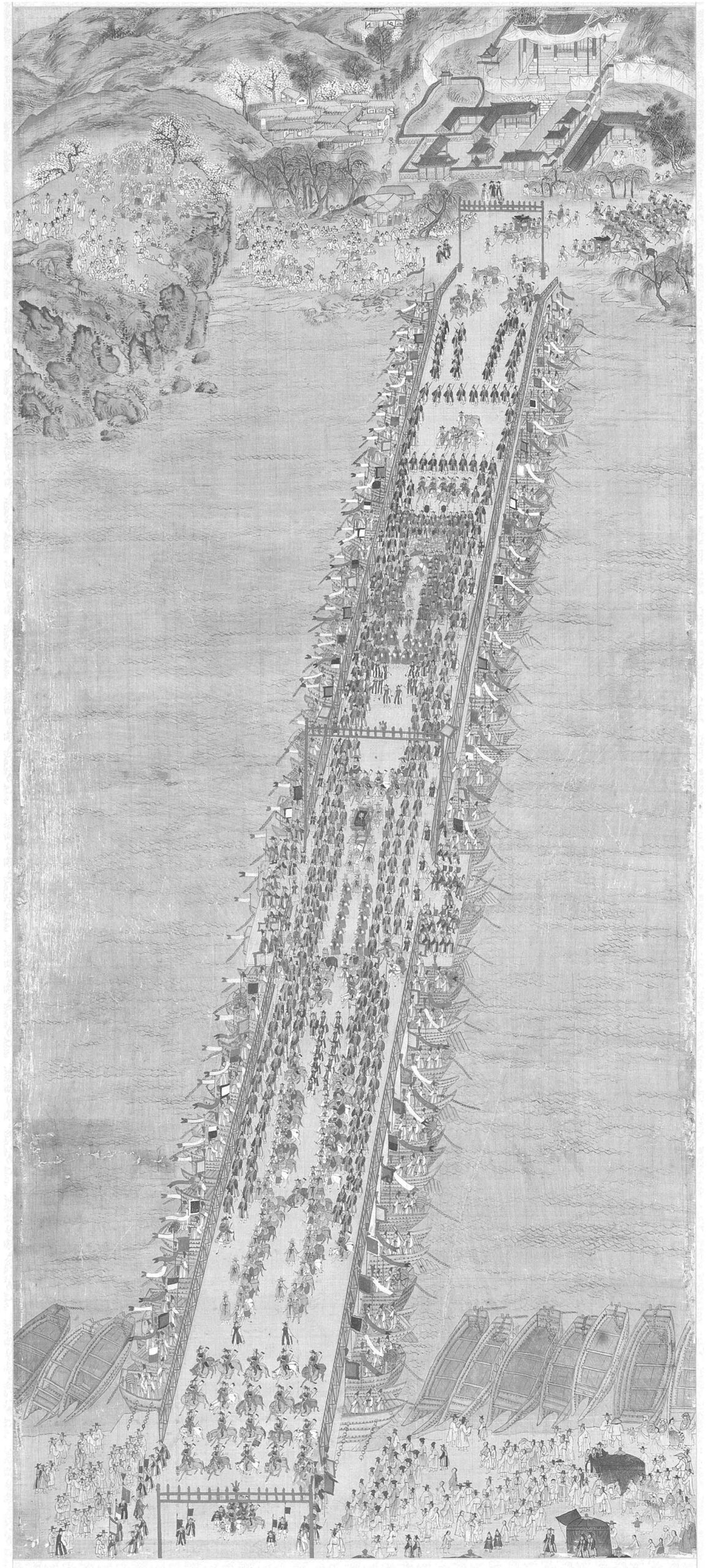 이 그림은 노량진에 설치된 배다리를 건너는 왕의 행렬을 그린 것이다.