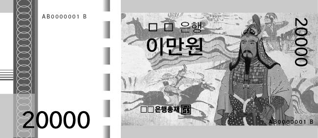 도안 소재 선정 이유 우리 모둠은 이 나라의 광개토 대왕과 무용총 수렵도를 선정하여 화폐 도안을 만들었습니다. 광개토 대왕은 만주 지역과 백제 등을 공략하여 영토를 크게 확장한 인물이고, 무용총 수렵도는 무예를 숭상하는 기풍을 보여주는 문화유산이기 때문에 도안의 소재로 선정하였습니다. |