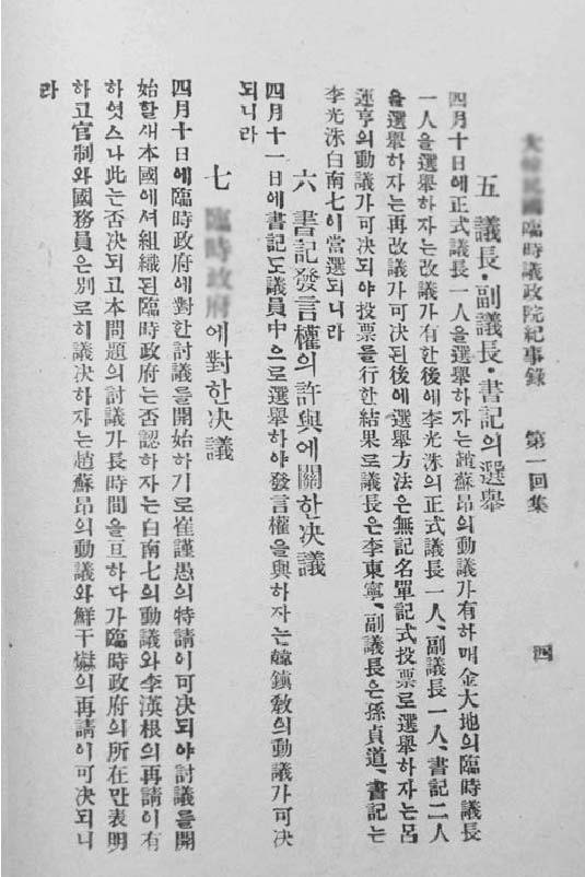 자료는 1919년 4월 10일 오후 10시에 개회해 다음 날 오전 10시에 폐회한 제1회 임시 의정원 기사록이다.