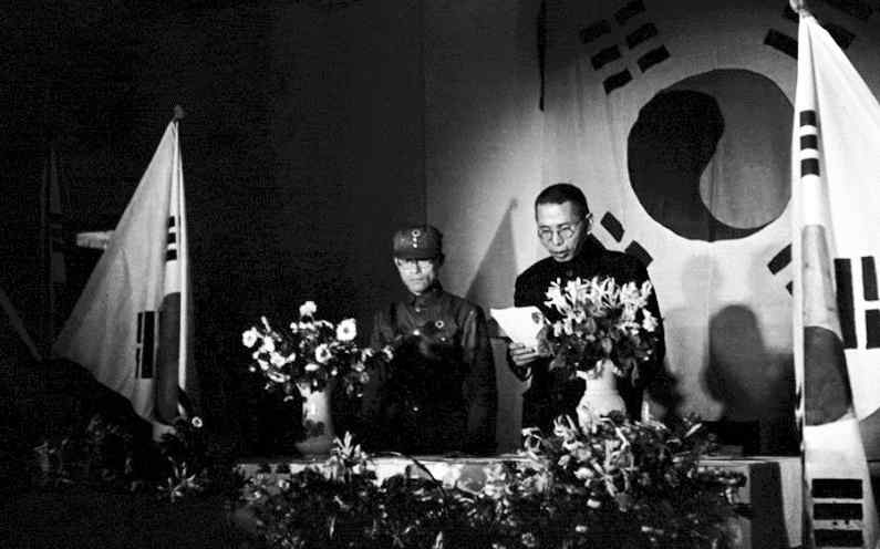 이 사진은 대한민국 임시 정부의 정규군인 (가)의 총사령부 성립 전례식에서 개회를 선포하는 김구 주석의 모습을 찍은 것이다. 충칭에서 열린 이 행사에서 대한민국 임시 정부는 일본에 대한 강력한 항전 의지를 천명하였다.