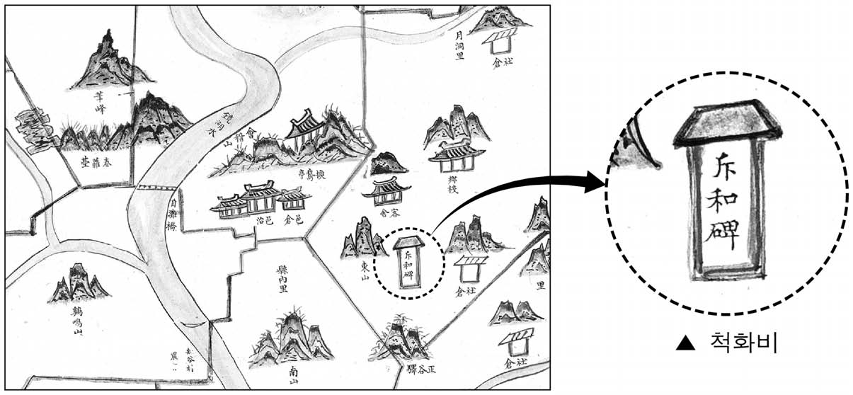 이 지도는 1872년 제작된 경상도 산청현 지도의 일부이다. 여기에는 당시 사회적 상황을 알 수 있는 다양한 정보들이 나타나 있는데, 그중 하나가 관아 부근에 건립된 척화비이다. 척화비는 미국의 군대가 강화도를 침입한 이 사건 이후 전국 각지에 건립된 것으로, 당시 조선 정부의 통상 수교 거부 의지를 확인할 수 있다. |