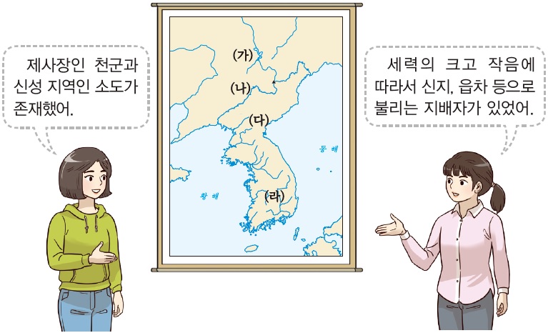 ‘삼한’에는 제사장인 천군과 신성 지역인 소도가 존재했다. 또한 신지, 읍차 등으로 불리는 지배자가 있었다.