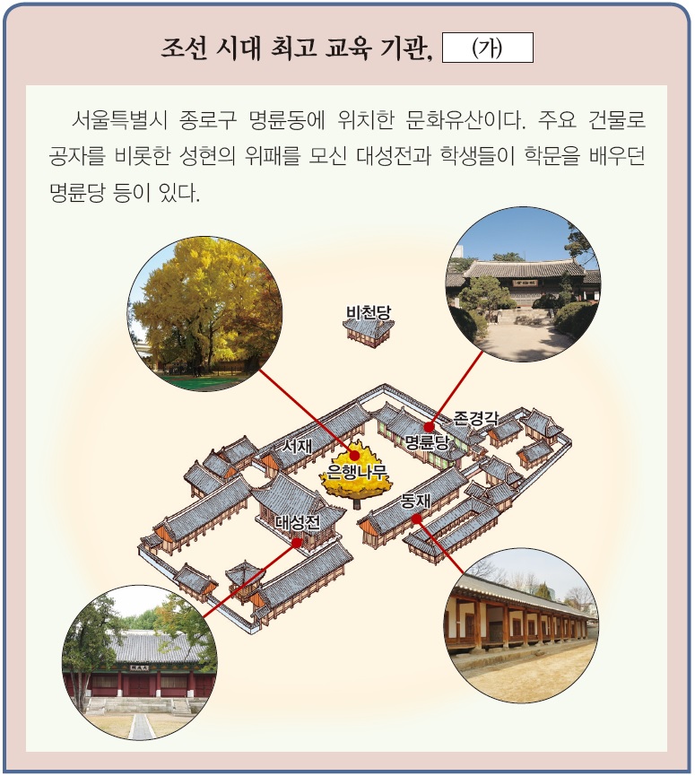 조선은 고려의 교육 제도를 이어받아 서울에 최고 학부의 구실을 하는 국립 교육 기관인 성균관을 두었다. 성균관의 입학 자격은 생원, 진사를 원칙으로 하였다. 주요 건물로 공자를 비롯한 성현의 위패를 모신 대성전과 학생들이 학문을 배우던 명륜당 등이 있다.