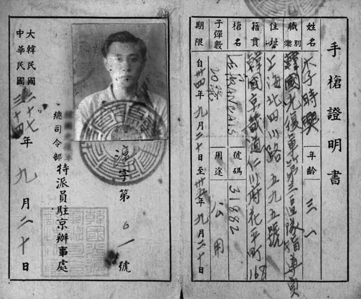 자료는 대한민국 임시 정부의 정규군인 (가)이/가 소속 대원의 무기 소지를 허가하는 증명서로 이름, 나이, 직업, 무기 종류 등이 적혀 있다. 중국 국민당 정부의 지원하에 충칭에서 창설된 (가)의 대원들은 이 증명서를 발급받아 무기를 휴대할 수 있었다. |