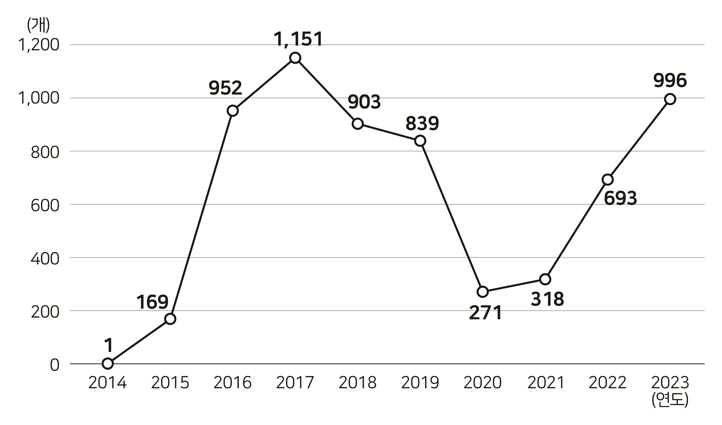 | 2015년 169개에 불과하던 푸드트럭의 창업 수는 2016년 952개, 2017년 1,151개로 증가하였으나, 그 이후 감소하였다가 다시 증가하여 2023년에는 996개에 이르렀다. |