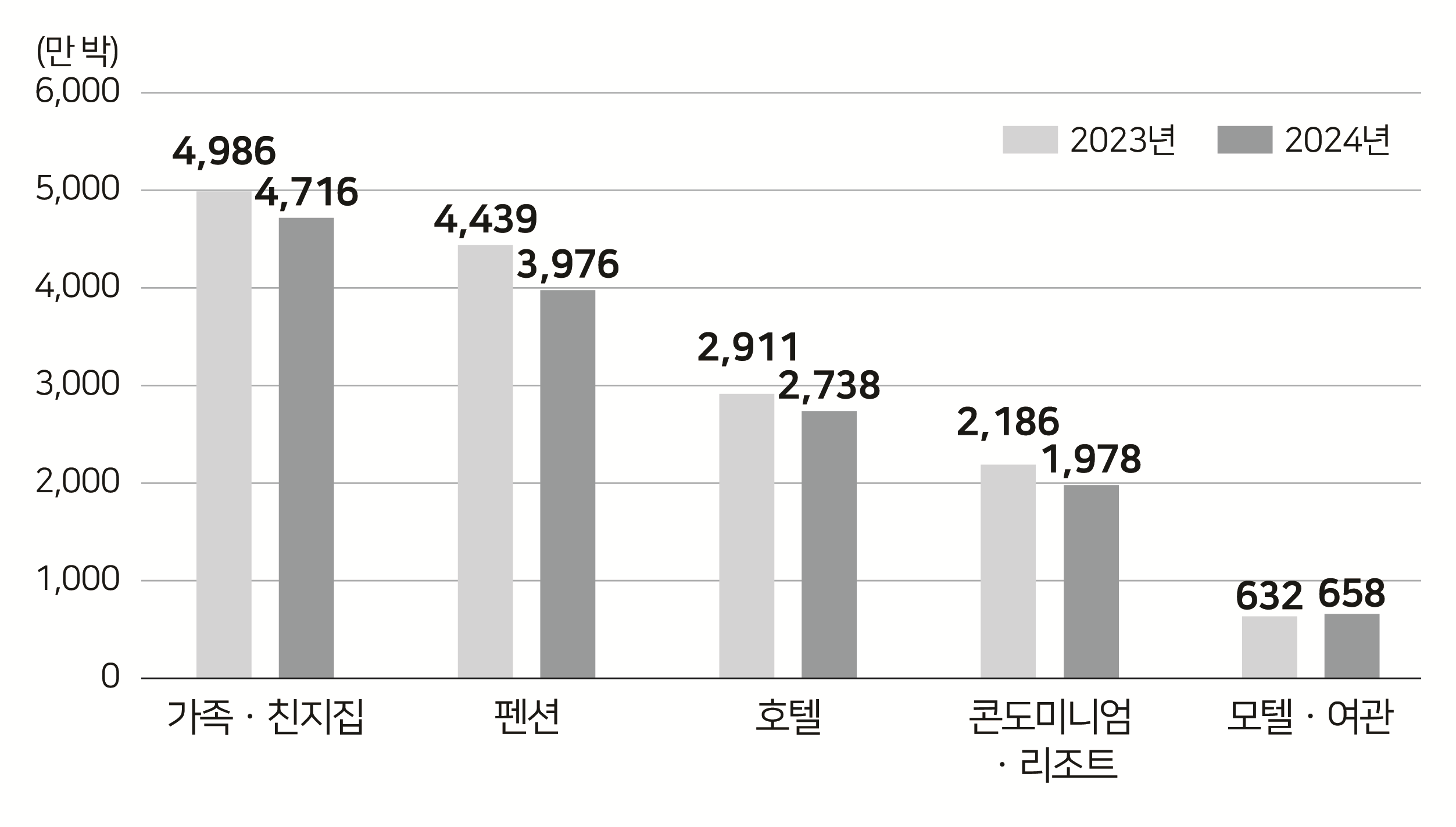 | 2024년 숙박시설 유형별 이용 총량 상위 5개를 비교하면, 이용 총량은 ‘가족ㆍ친지집’이 4,716만 박으로 가장 많았고, 다음은 ‘펜션’, ‘호텔’, ‘콘도미니엄ㆍ리조트’, ‘모텔ㆍ여관’ 순이었다. |