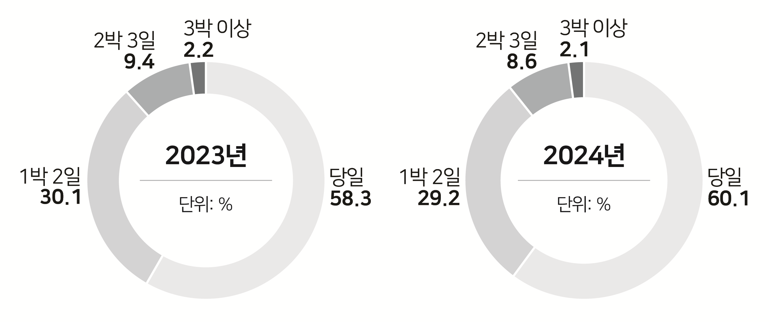 | 2024년 국내여행 일정에서 ‘당일’이 차지하는 비중은 60.1%로 가장 크게 나타났고, 다음은 ‘1박 2일’, ‘2박 3일’, ‘3박 이상’ 순으로 나타났다. 특히, 2024년 국내여행 일정별 비중은 ‘당일’이 전년 대비 증가하였다. |
