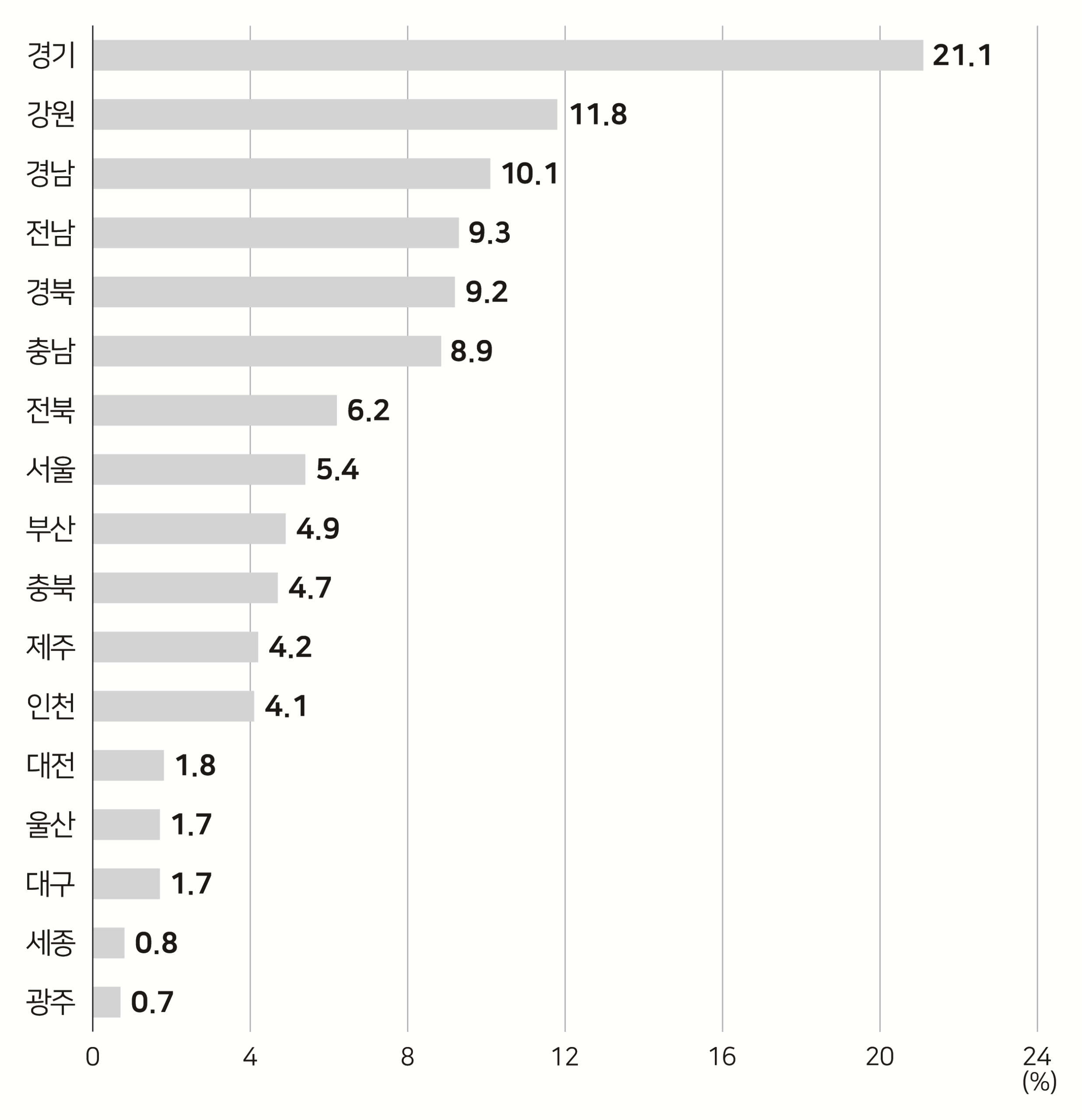 | 2024년 국내여행 방문 지역별 응답 비율은 ‘경기’가 21.1%로 가장 높게 나타났으며, 다음은 ‘강원’, ‘경남’, ‘전남’, ‘경북’, ‘충남’ 순으로 나타났다. |